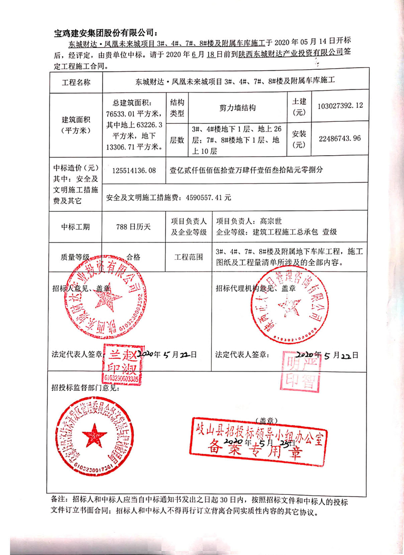 东城财达·凤凰未来城项目3#、4#、7#、8#楼及附属车库施工中标通知书