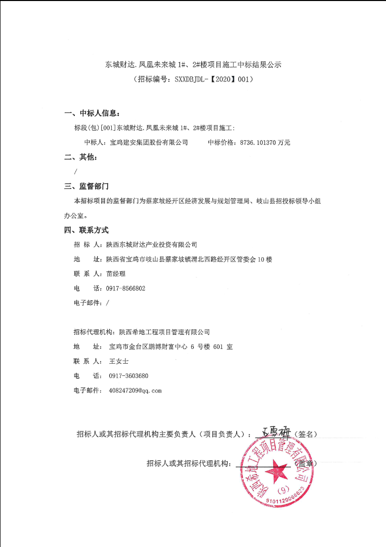 001东城财达·凤凰未来城1#、2#楼项目施工及东城财达·凤凰未来城一期项目监理中标公告