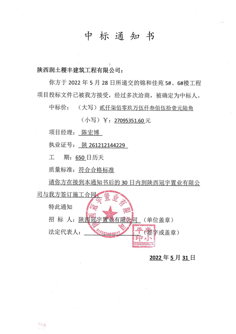 锦和佳苑5#、6#楼工程中标通知书