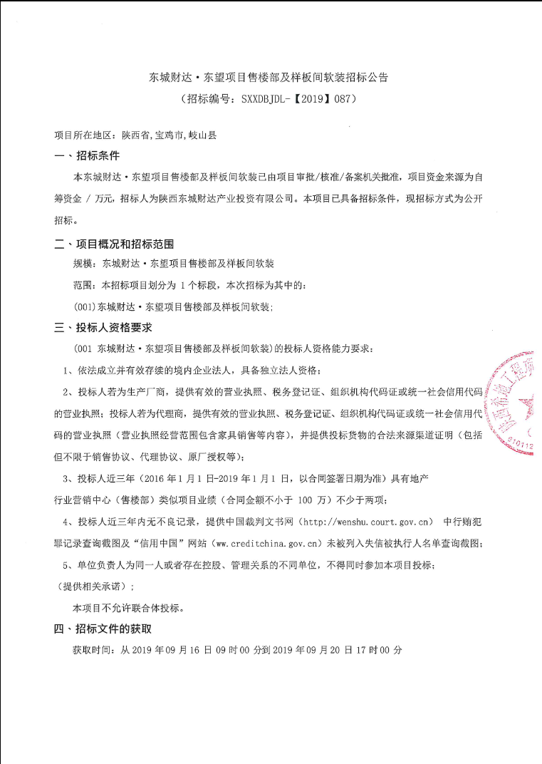 东城财达·东望项目售楼部及样板间软装招标公告