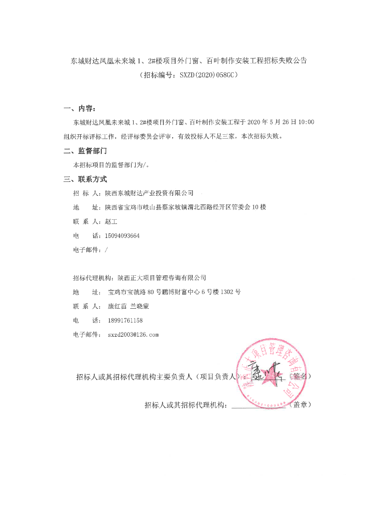 东城财达凤凰未来城1、2#楼项目外门窗、百叶制作安装工程招标失败公告