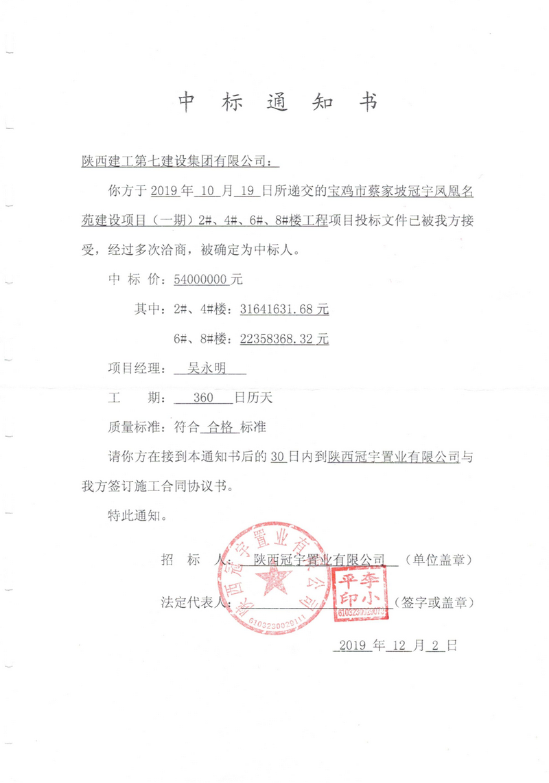 [下一篇] 冠宇凤凰茗苑建设项目1#、3#、5#楼及地下工程中标通知书